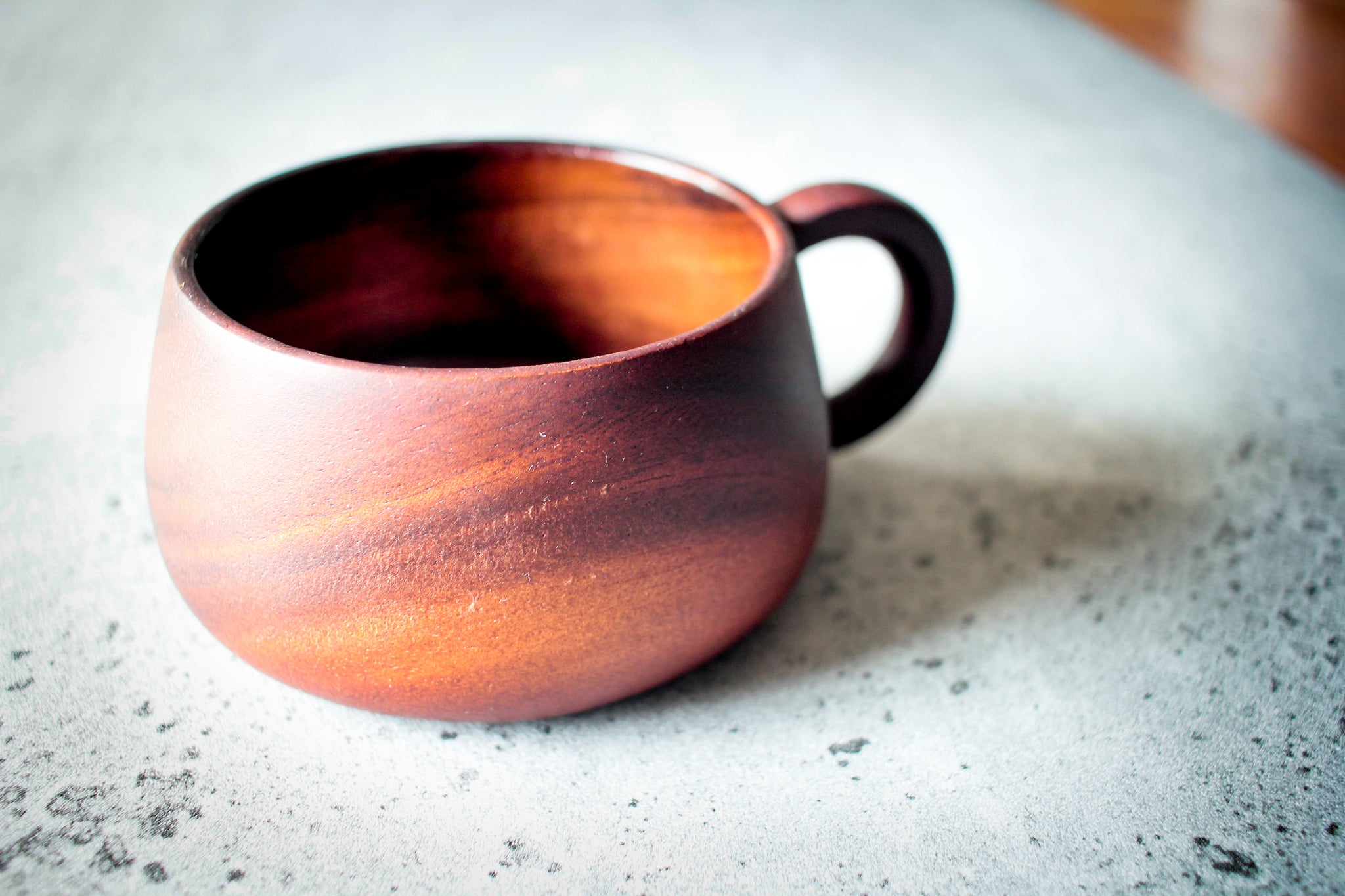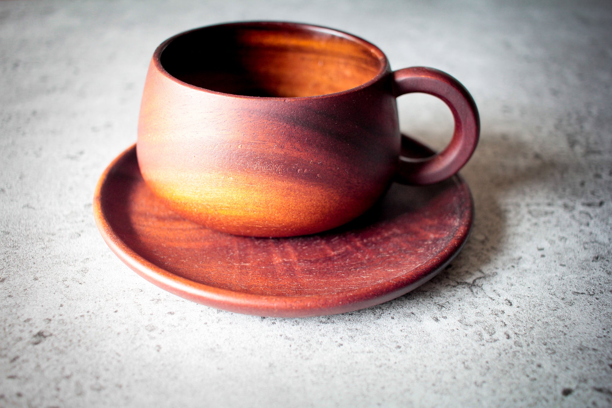Side view revealing elegant wood grain on cup and saucer