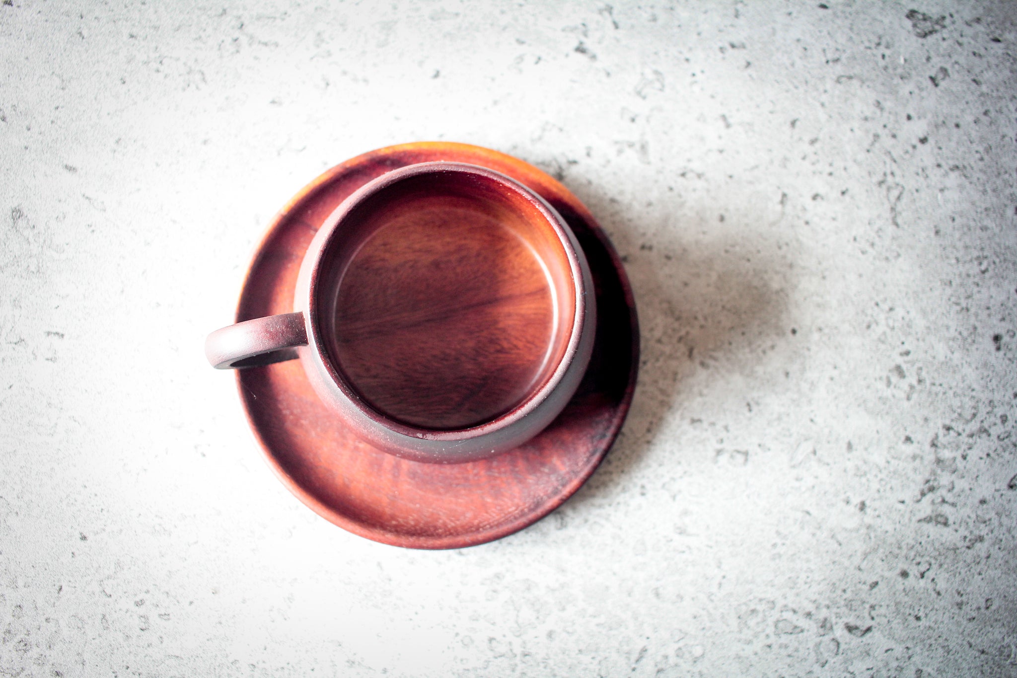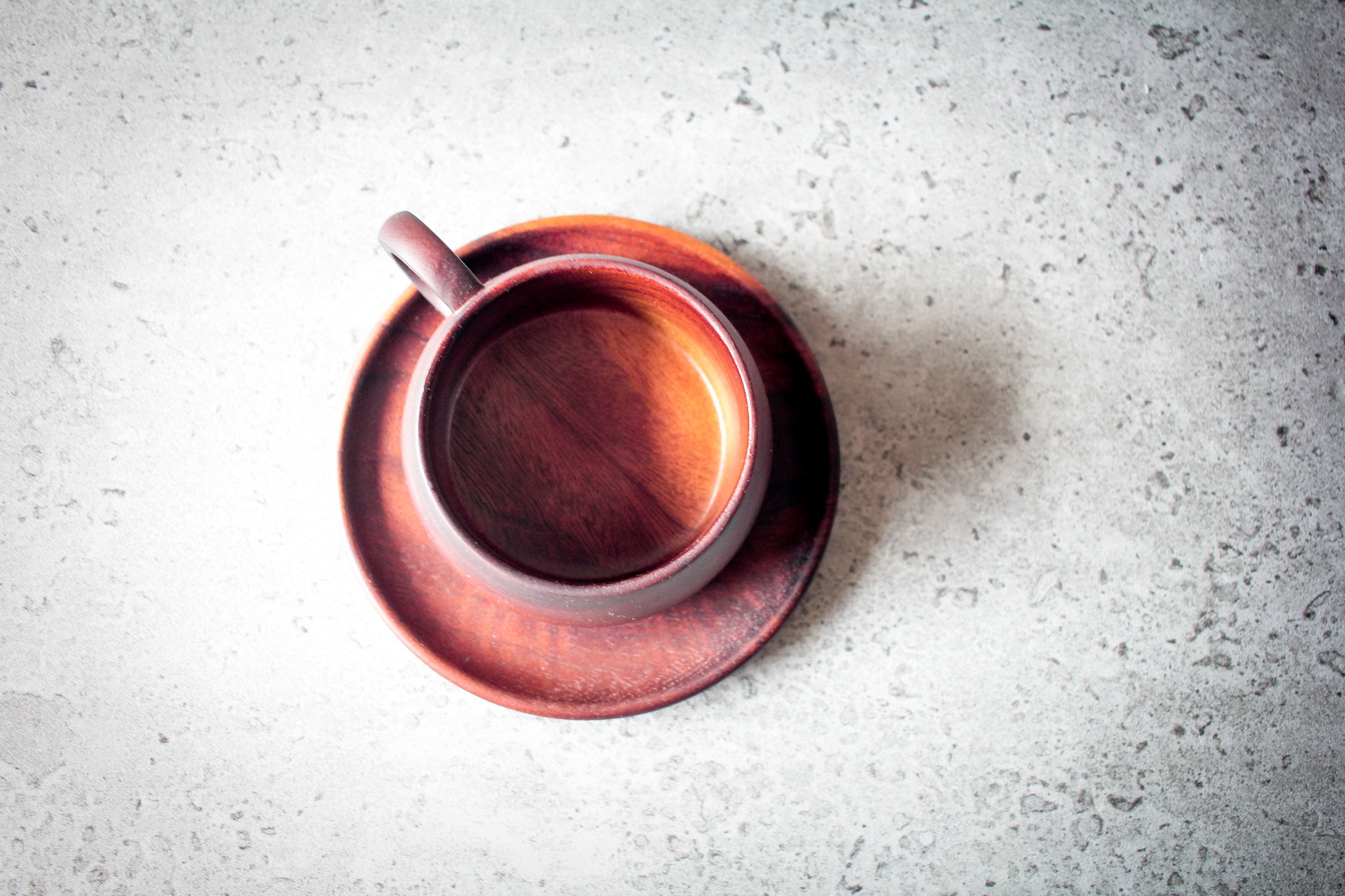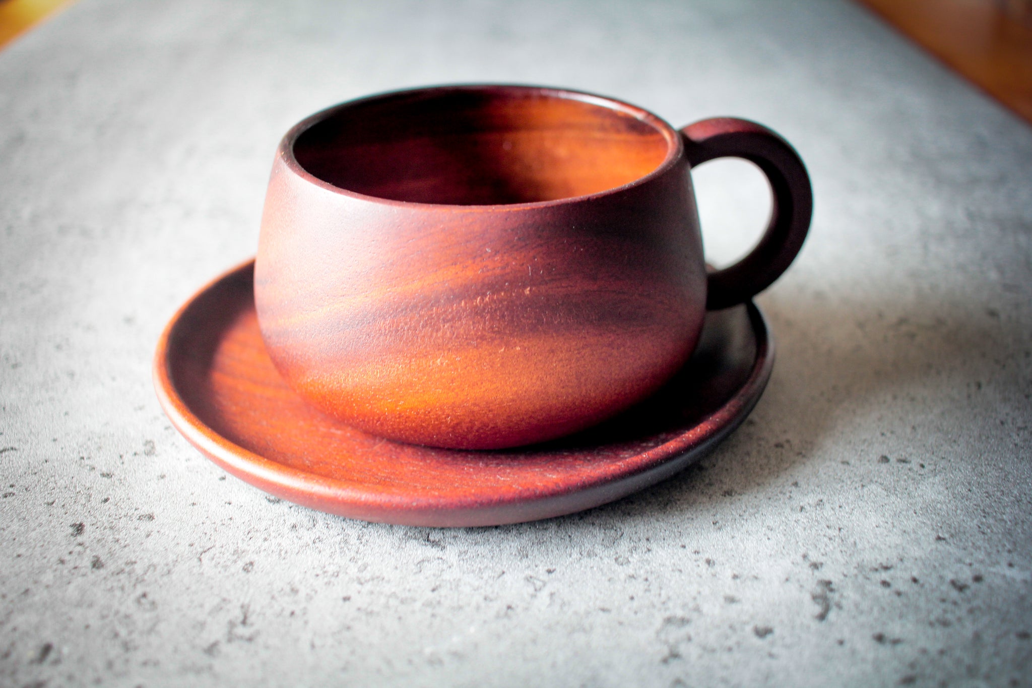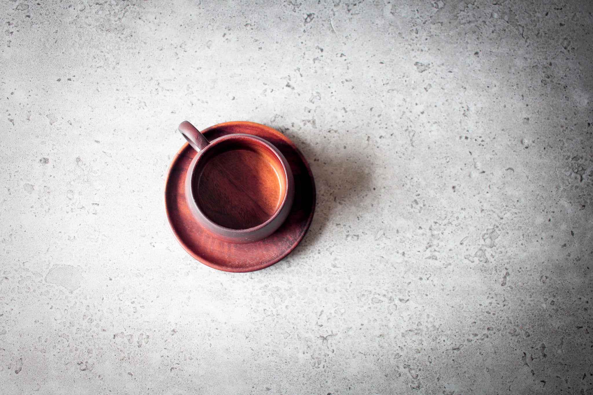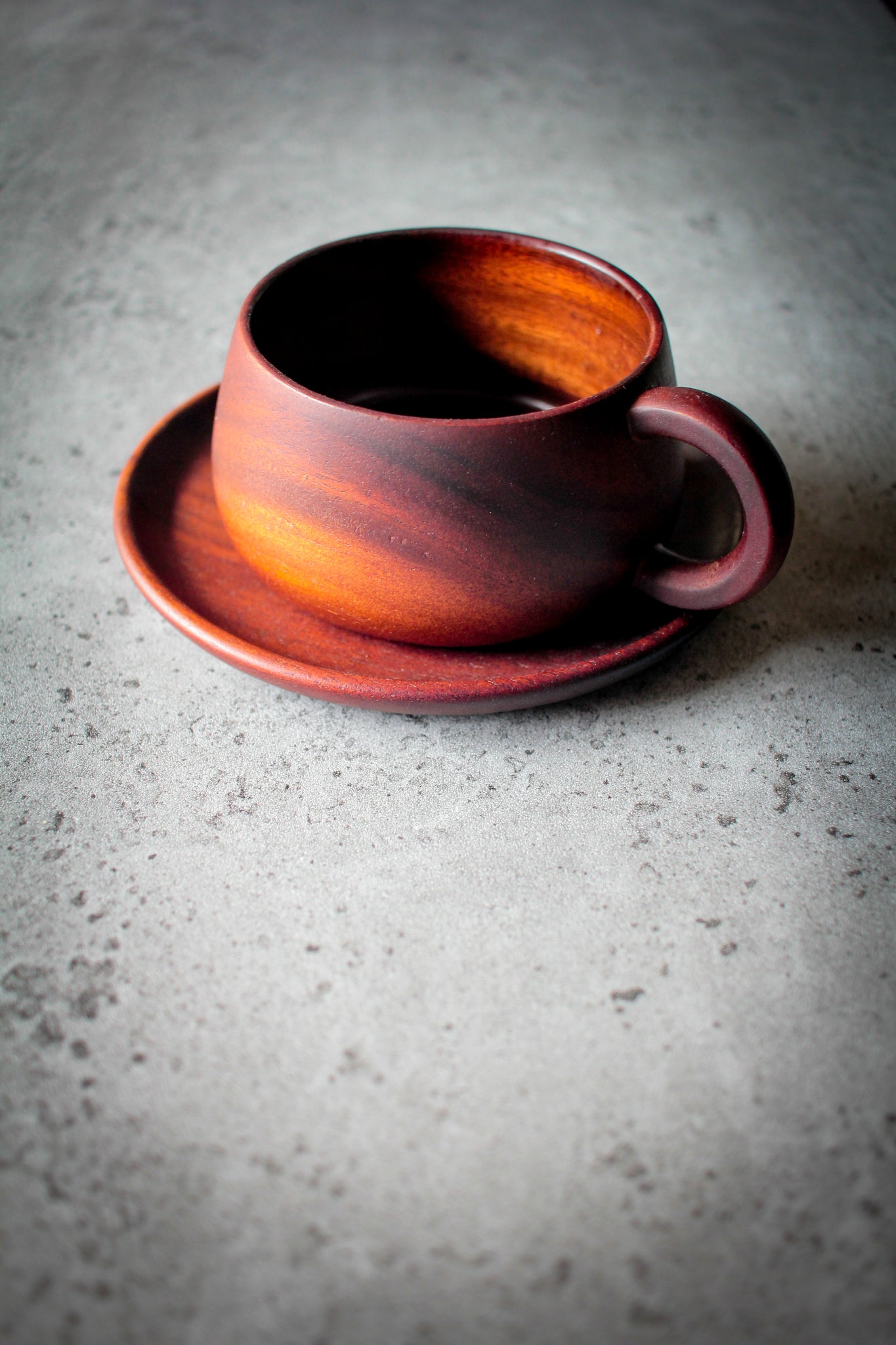Minimalist arrangement: dark acacia cup sits on matching saucer