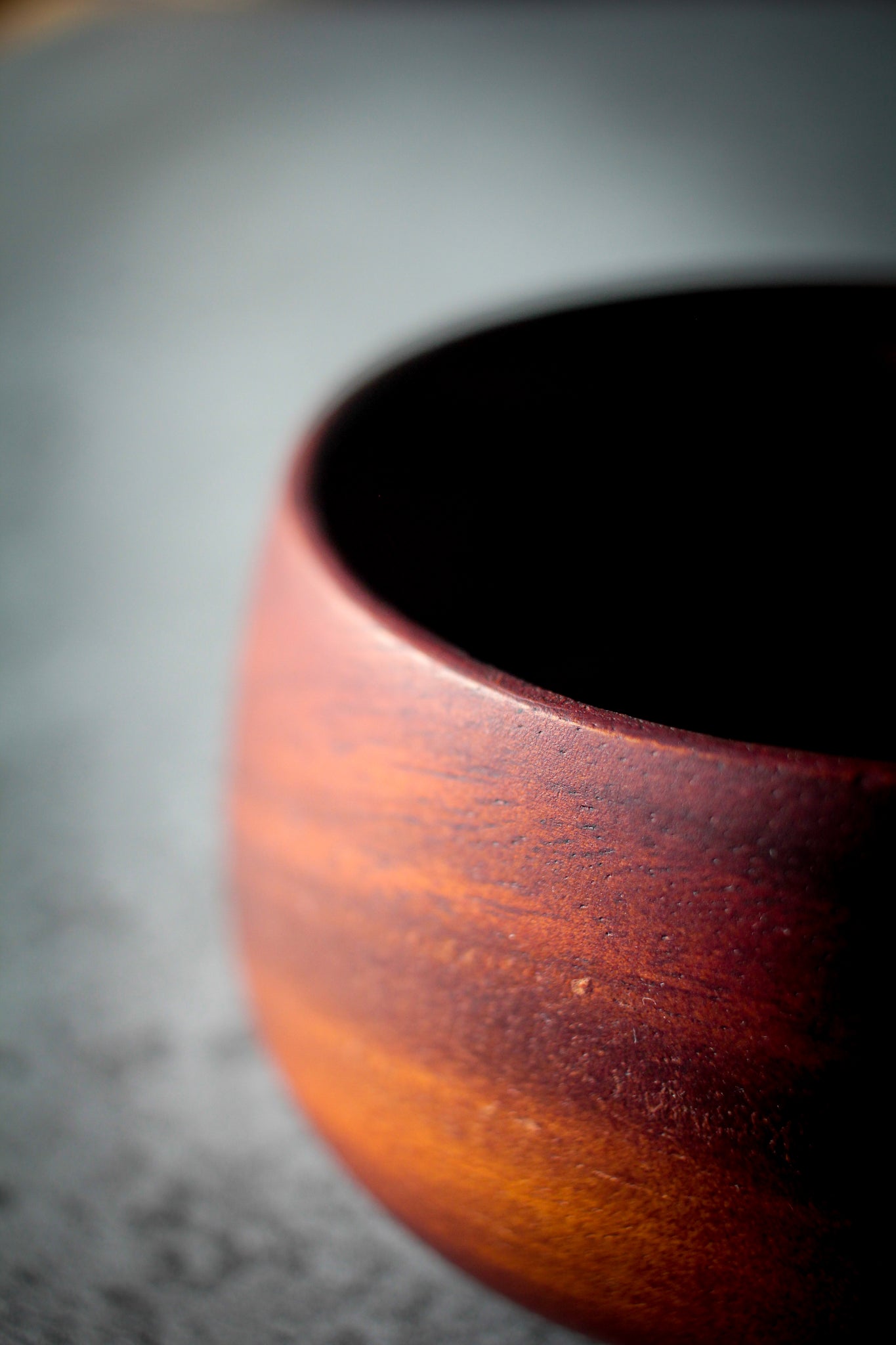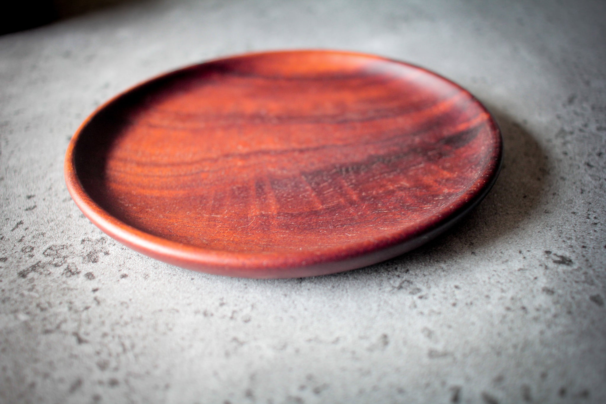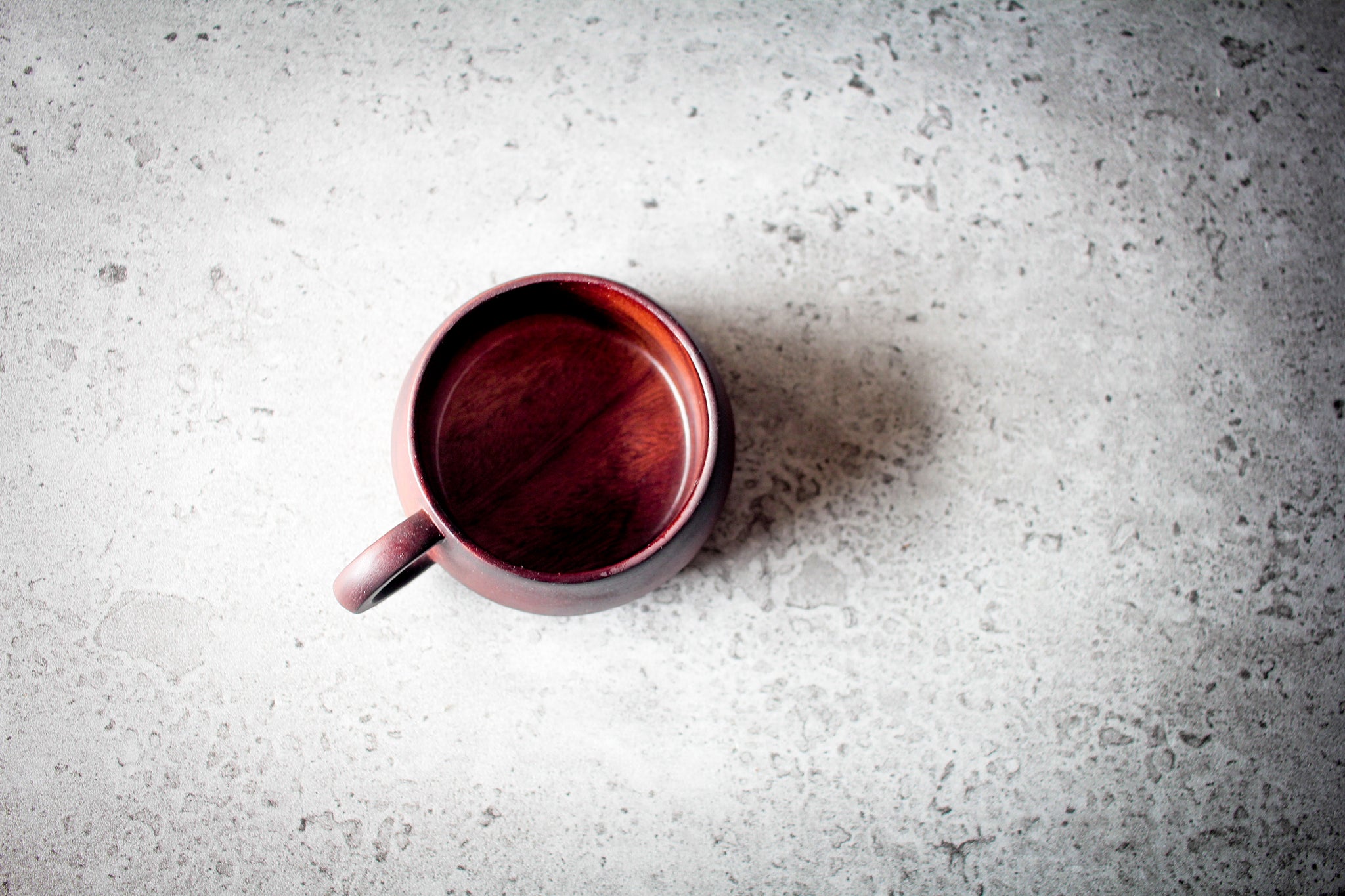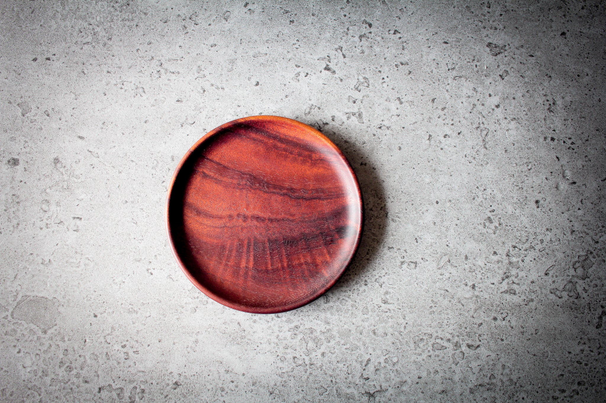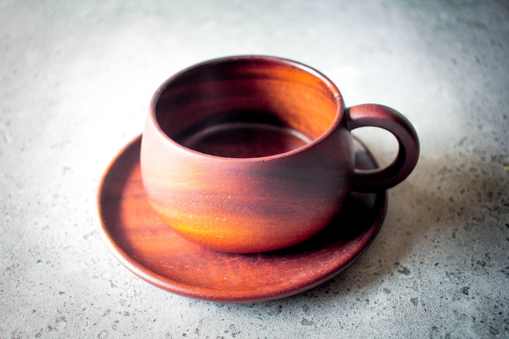 Minimalist arrangement: dark acacia cup sits on matching saucer