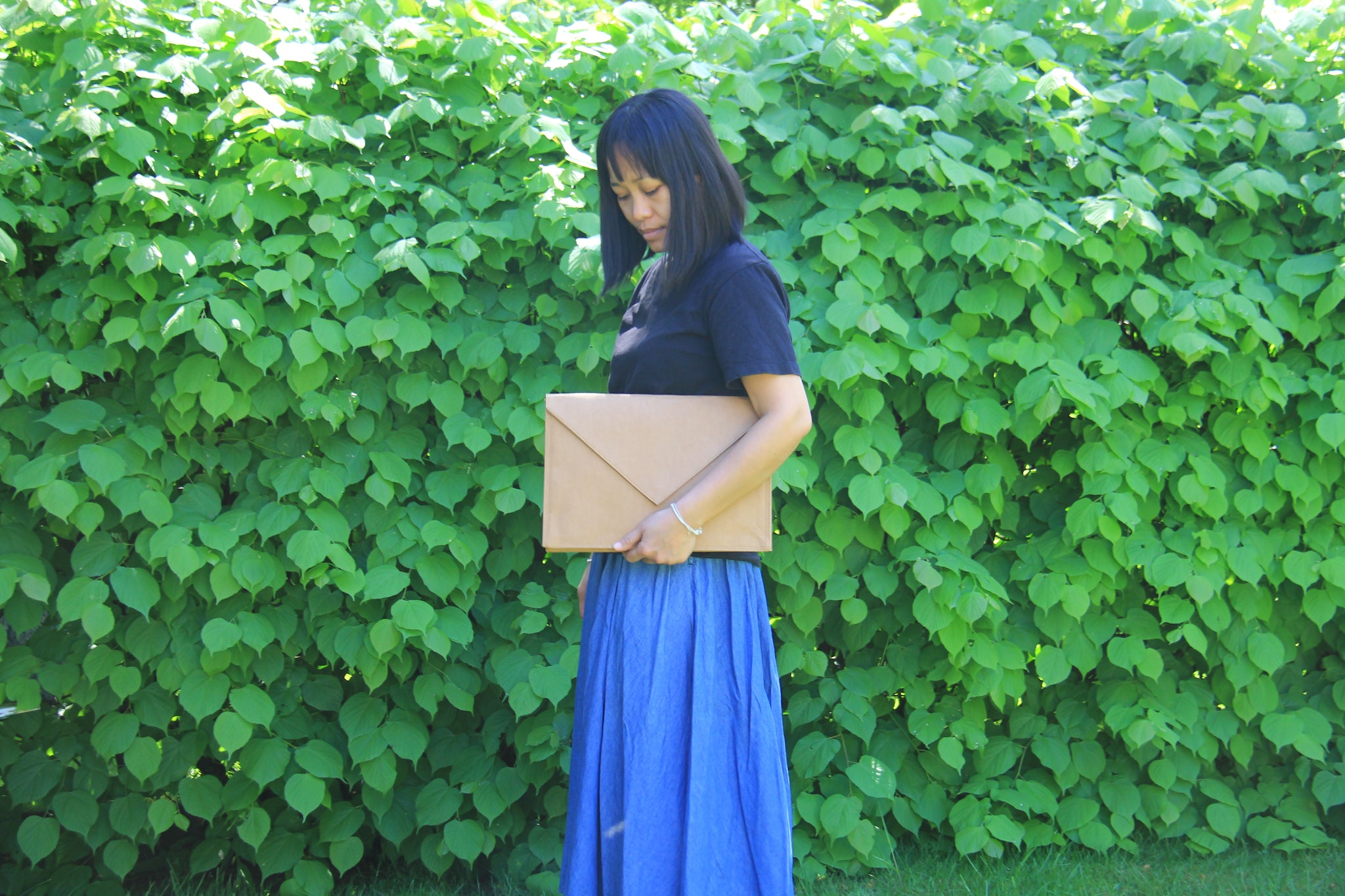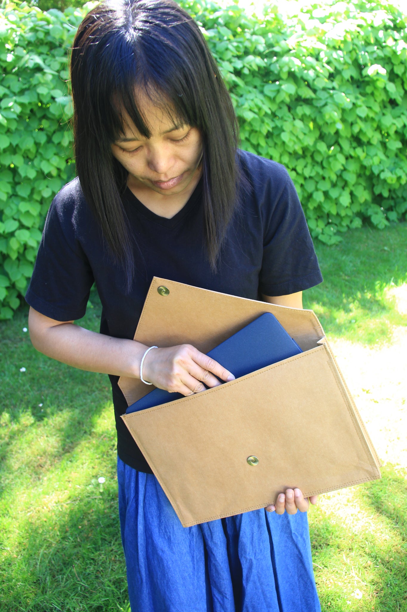Lightweight, washable kraft paper laptop sleeve with soft inner lining. Stylish natural laptop case with magnetic closure and document pockets