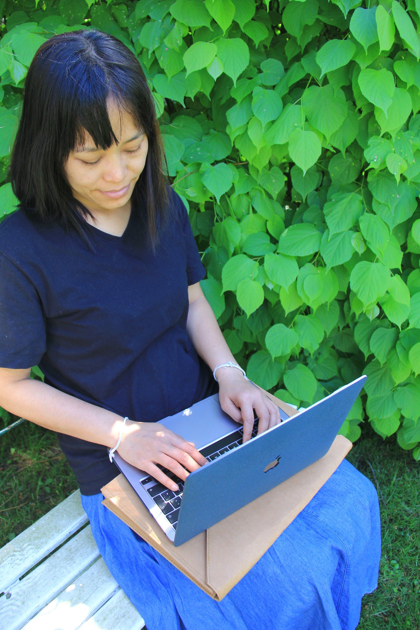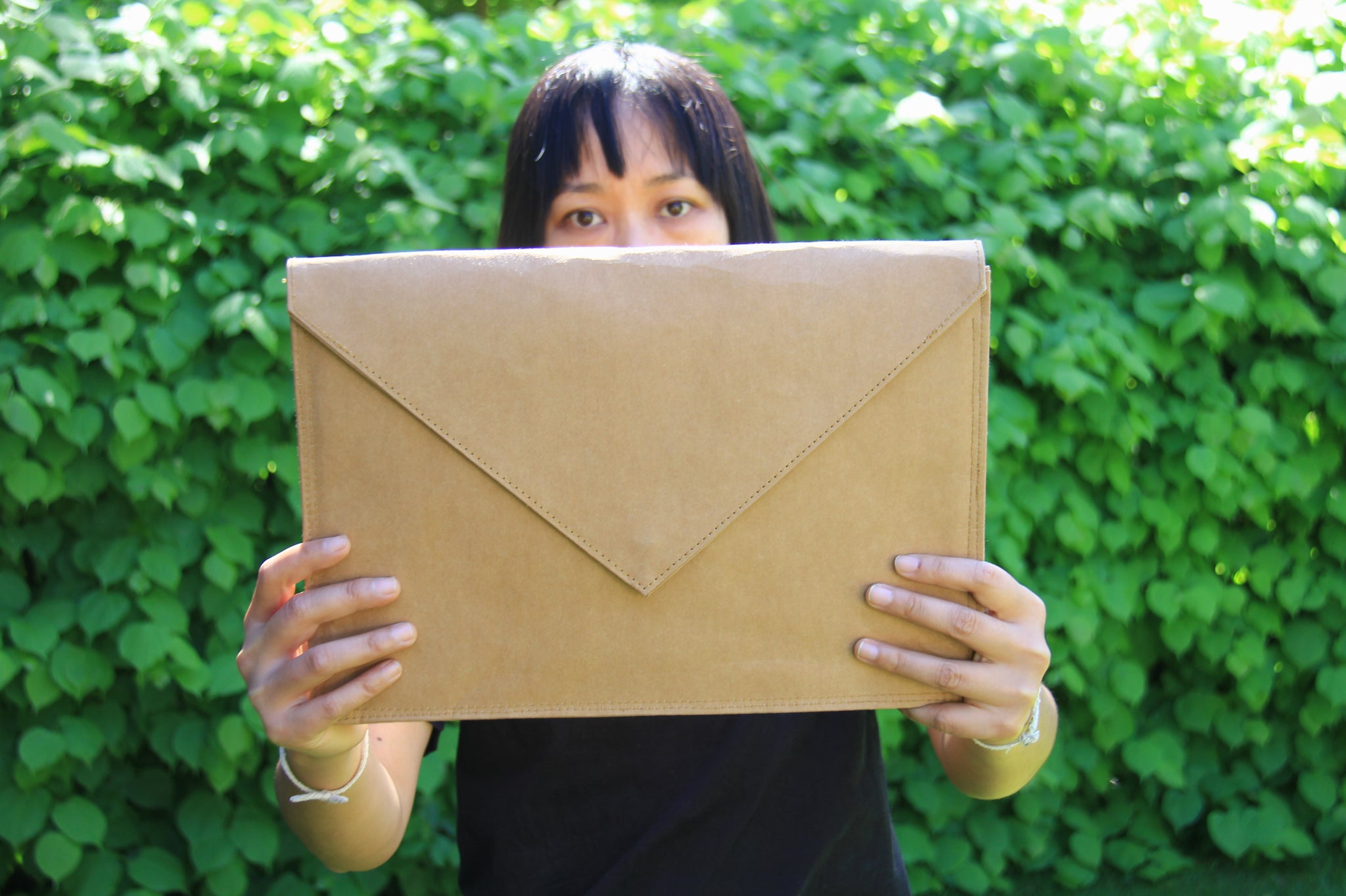 Tear-resistant vegan laptop sleeve with soft inner lining and padding.⁠ ⁠Sustainable MacBook case made from kraft paper with magnetic closure, handmade