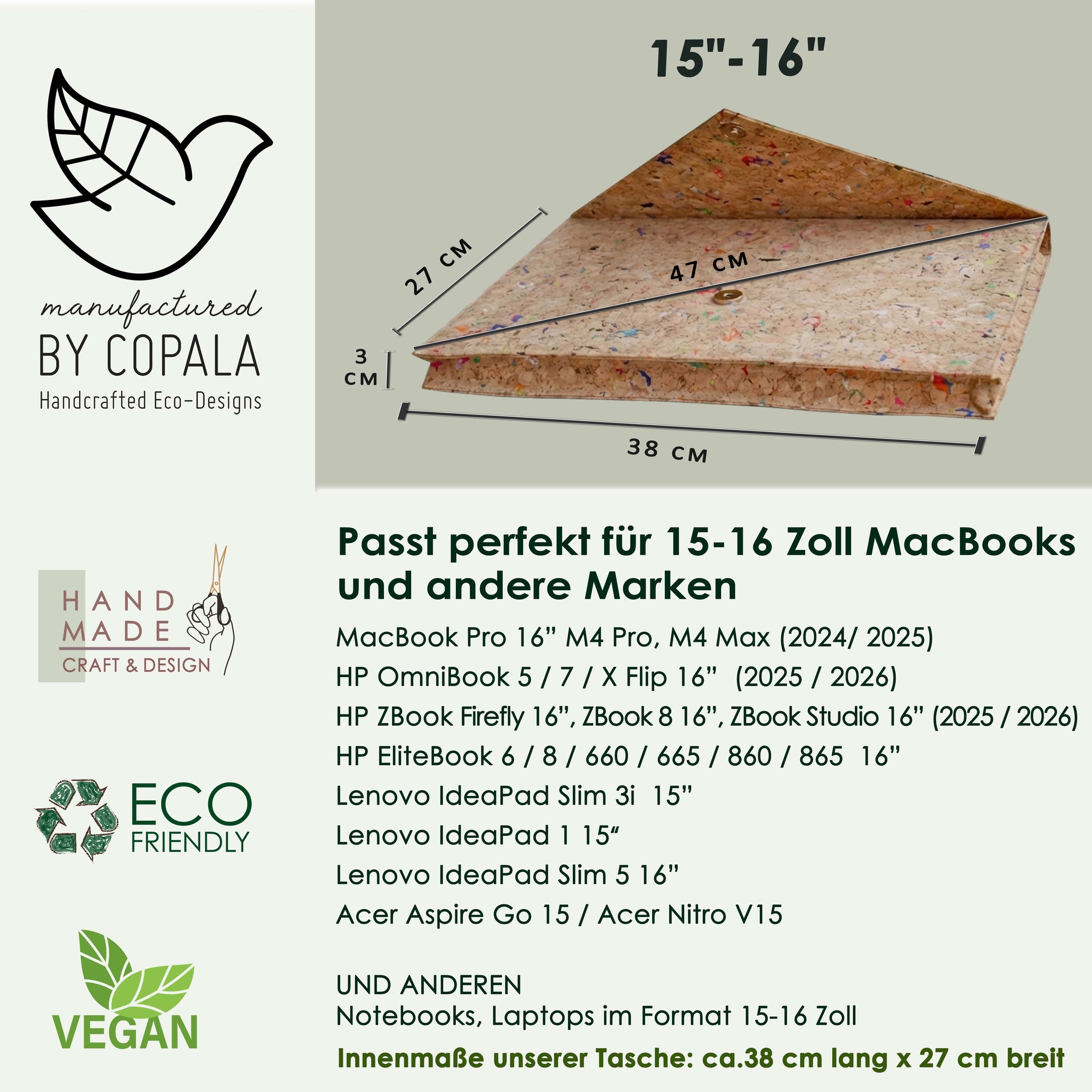 Sustainable padded Cork laptop sleeve / bag, handmade & vegan, naturally water-repellent suitable for notebooks and laptops in 15" - 16" sizes.